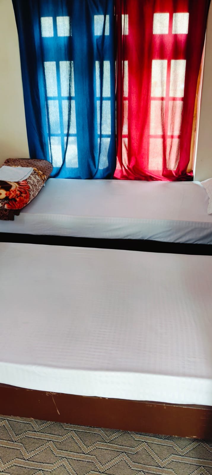 Guests can enjoy serene views of the surrounding mountains and farmland right from their windows. The room has access to a clean, shared Western-style bathroom with 24×7 hot water (geyser/solar-based), basic toiletries, and a bucket and mug.