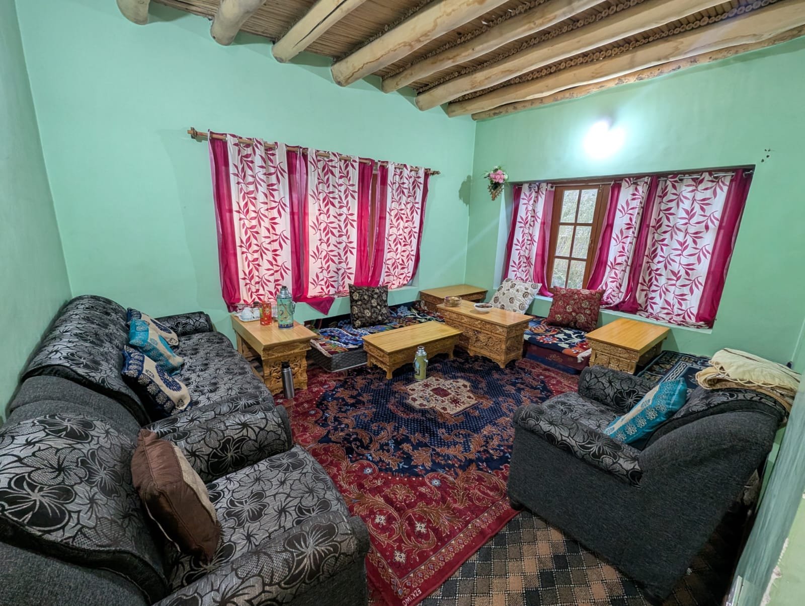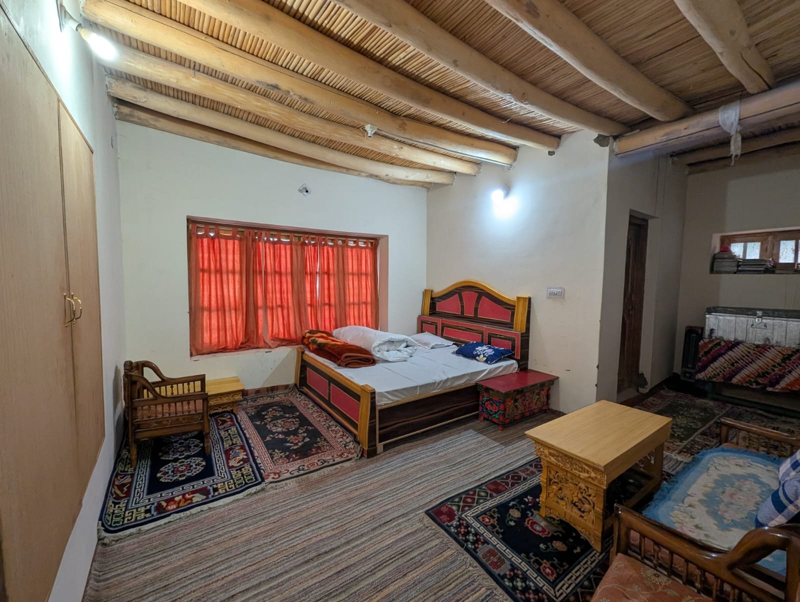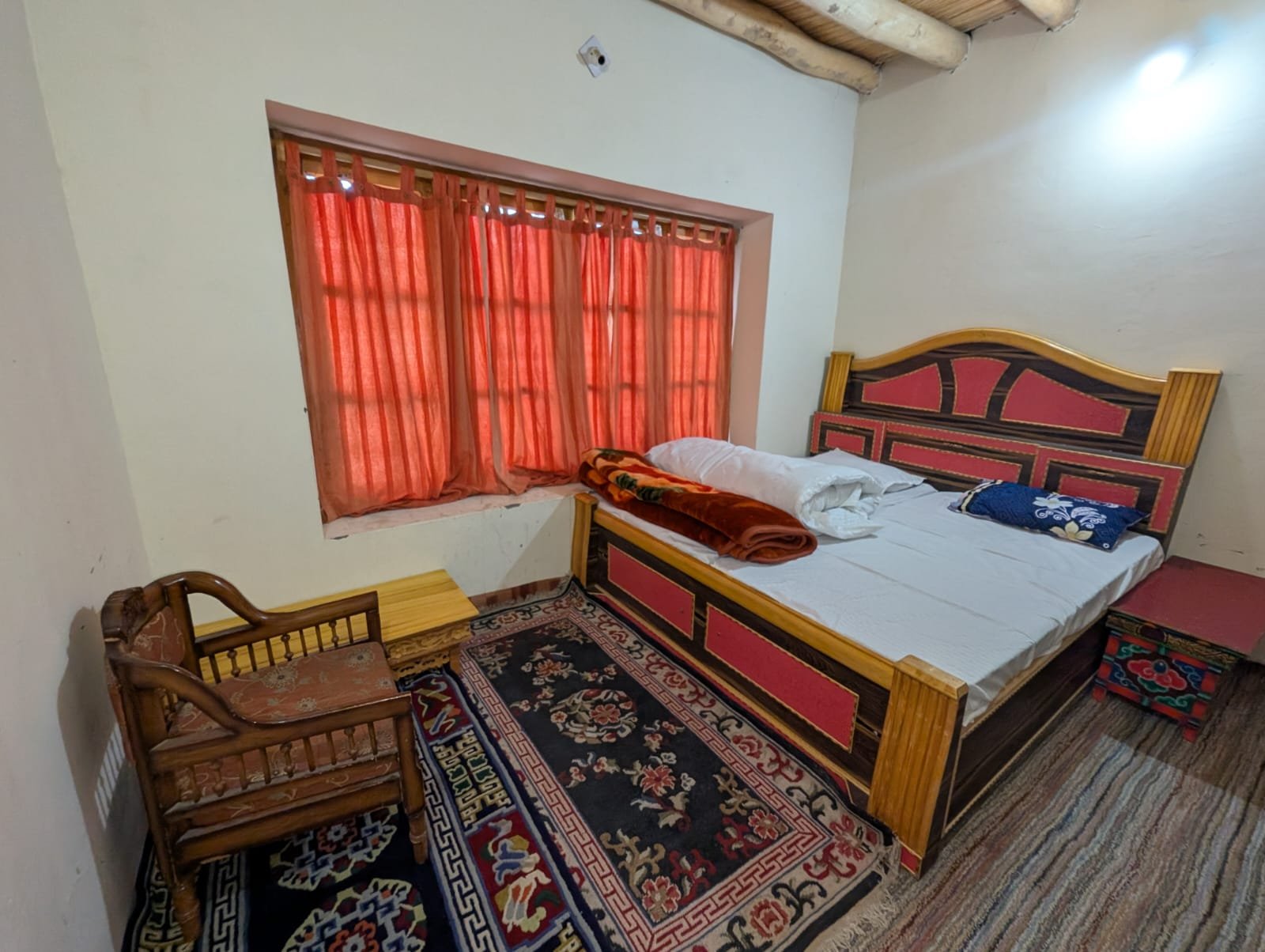 1 private room with a comfortable double bed & extra blankets.  Attached washroom with running hot water.  Access to a common Ladakhi-style dining area, a Peaceful kitchen garden with seasonal produce.  A safe parking area is available for two-wheelers and small vehicles