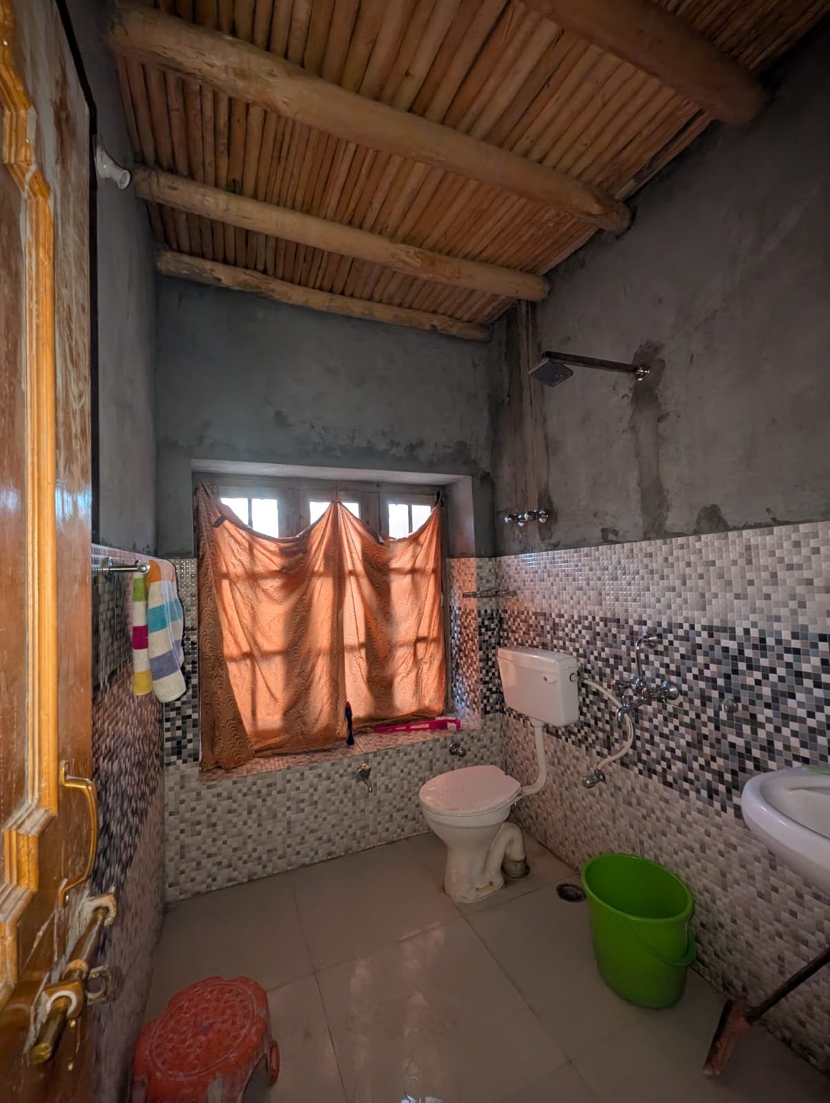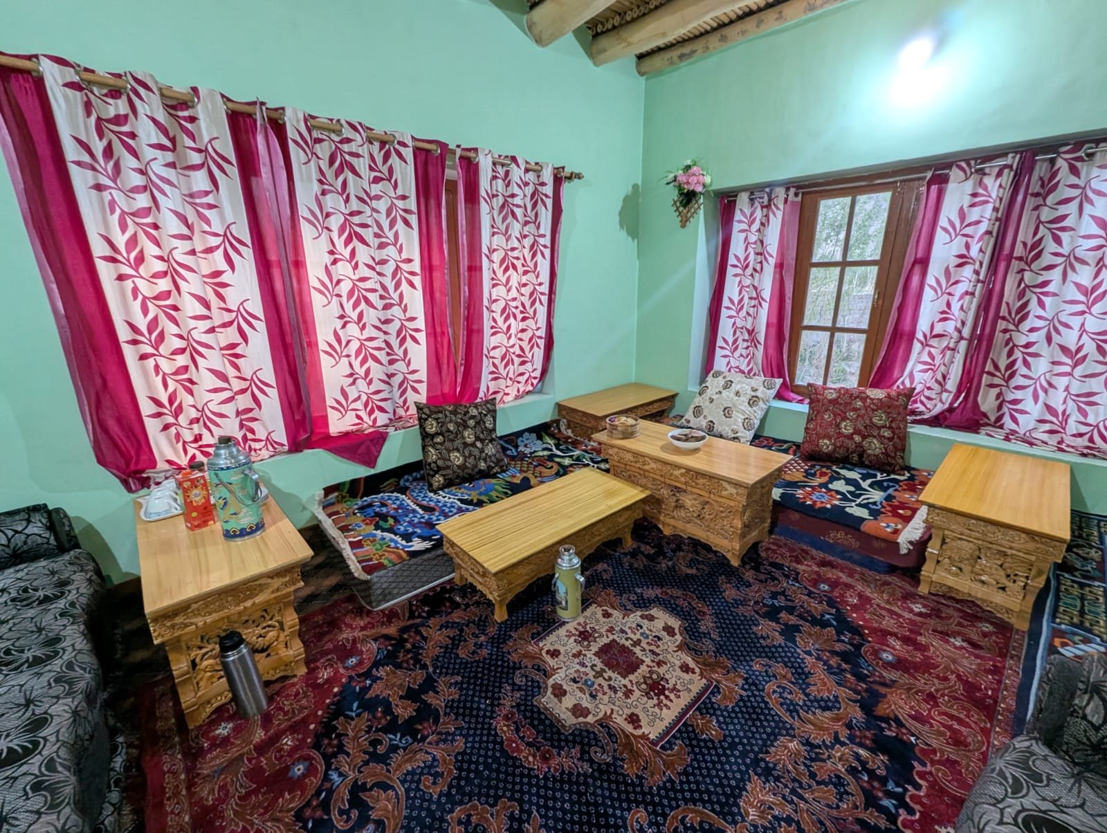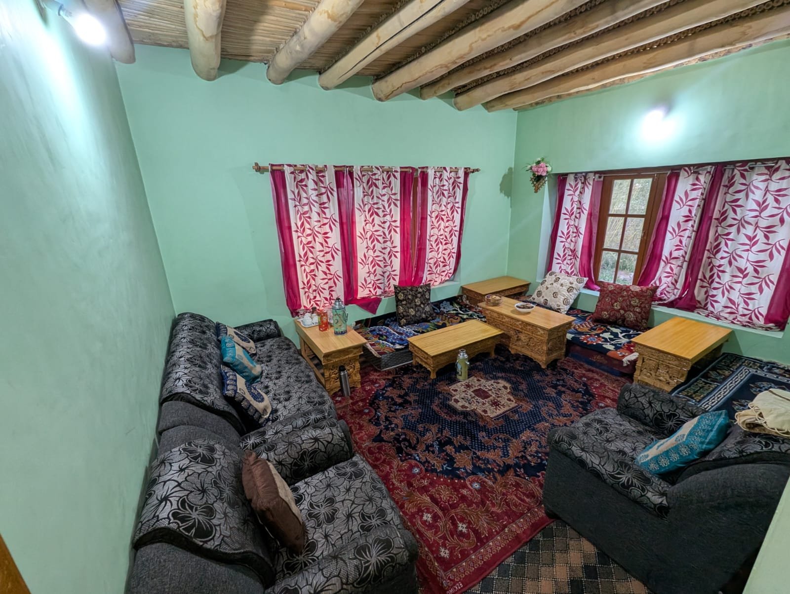 1 private room with a comfortable double bed & extra blankets.  Attached washroom with running hot water.  Access to a common Ladakhi-style dining area, a Peaceful kitchen garden with seasonal produce.  A safe parking area is available for two-wheelers and small vehicles