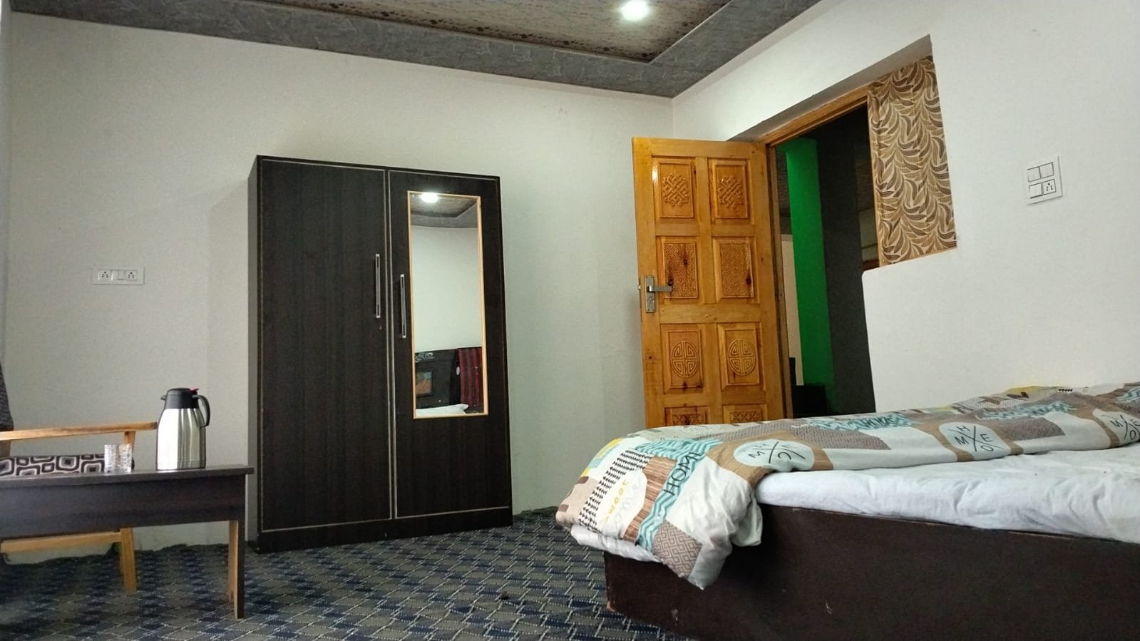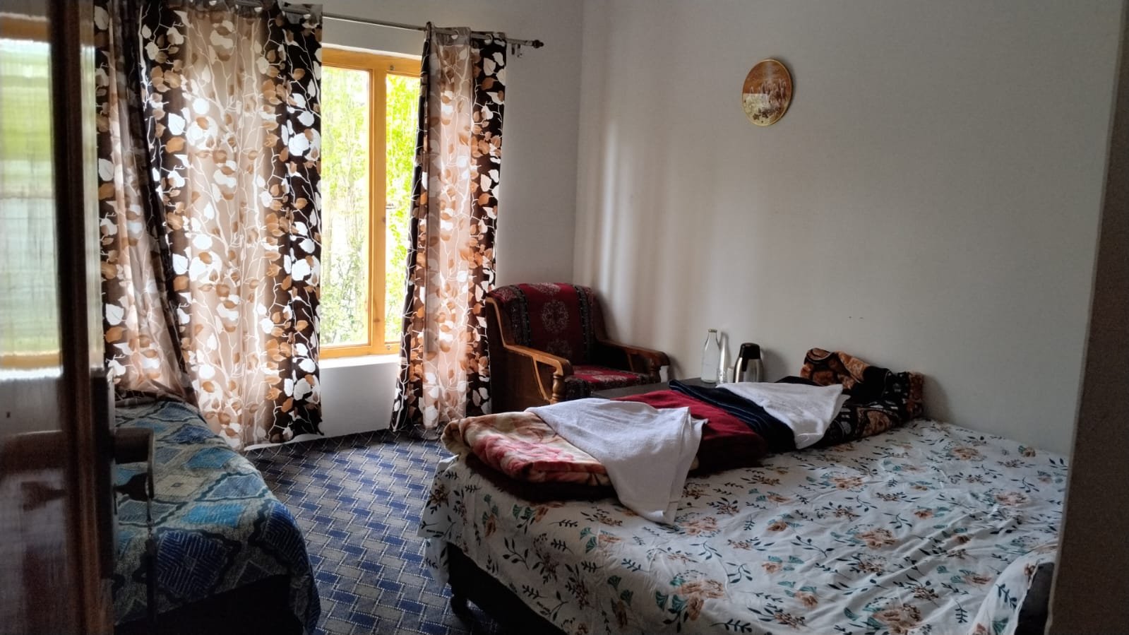 Our Standard Double Rooms offer a simple, clean, and authentic Ladakhi stay—perfect for friends, couples, or solo travelers. Each room features a comfortable double bed with cozy bedding and warm blankets, a table and chair, a wardrobe, and other basic amenities like a dustbin. Guests have access to a clean shared bathroom with running hot and cold water, as well as outdoor seating and a common lounge area to relax and enjoy the peaceful surroundings of Phyang village.